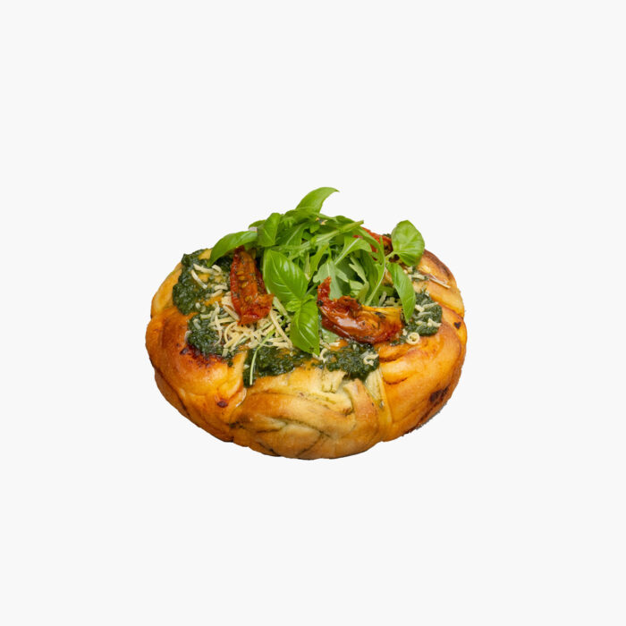 Brioche brood met groene pesto, zongedroogde tomaatjes, rucola en basilicum.
