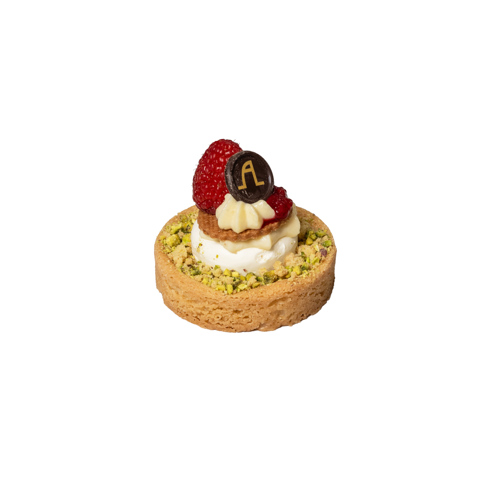 Sloffenbodem, witte chocolade mousse, frambozen compote, pistache en vanille.